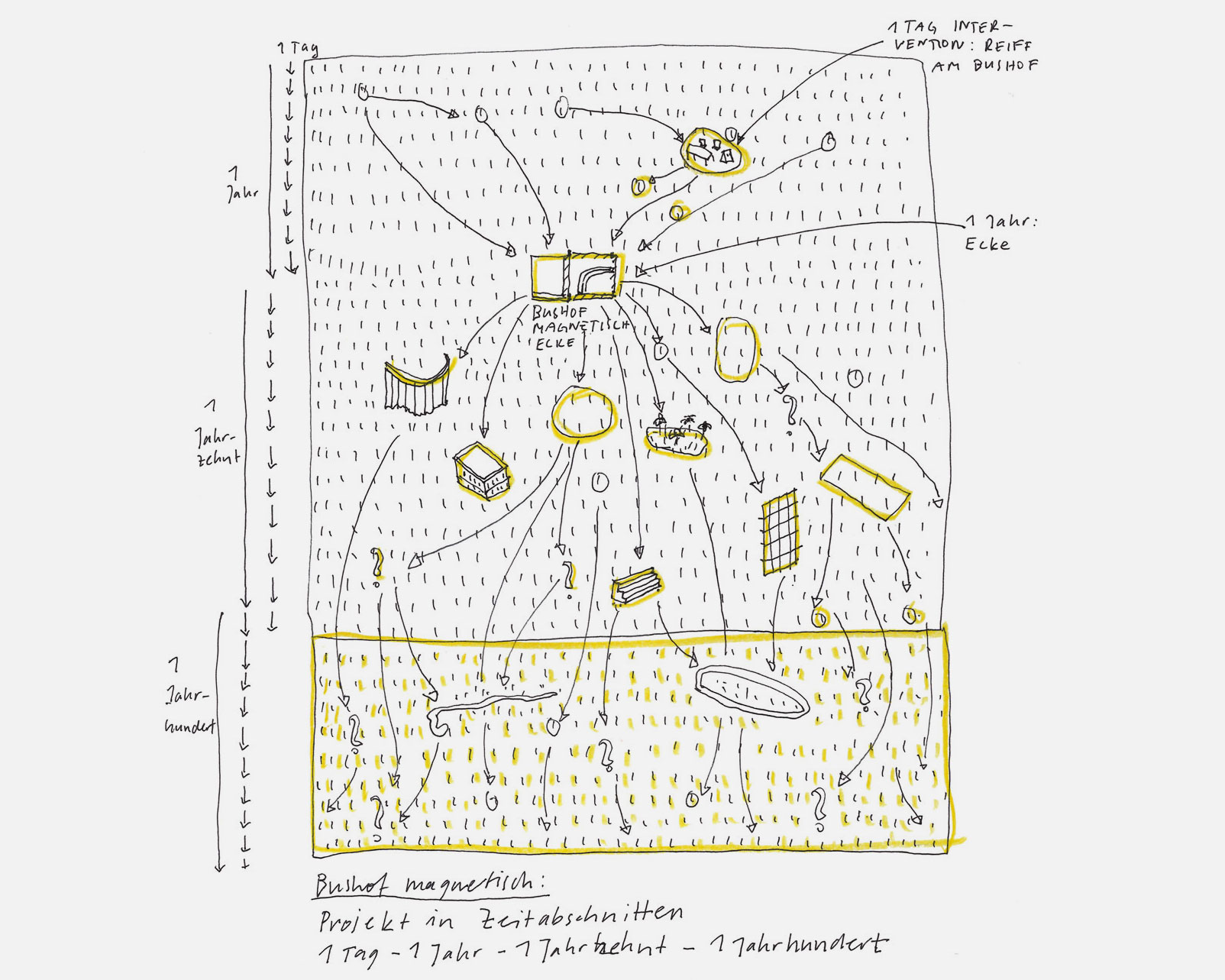 Der Erklärung des konkreten Entwurfs soll eine Überlegung vorangestellt werden: Das Suchen einer „sauberen Lösung“ wird oft einer viel komplexeren Realität nicht gerecht. Daher soll eine Planung in Zeitebenen vorgeschlagen werden. Was heißt das genau?Jede Projektierung und Umsetzung werden einer entsprechend ihrer zeitlichen Umsetzbarkeit kategorisiert. Es gibt folgende Zeitebenen: ein Tag, ein Jahr, ein Jahrzehnt und ein Jahrhundert. Jedem Zeitstück kommt eine unterschiedliche Rolle zu.